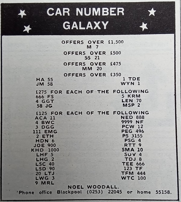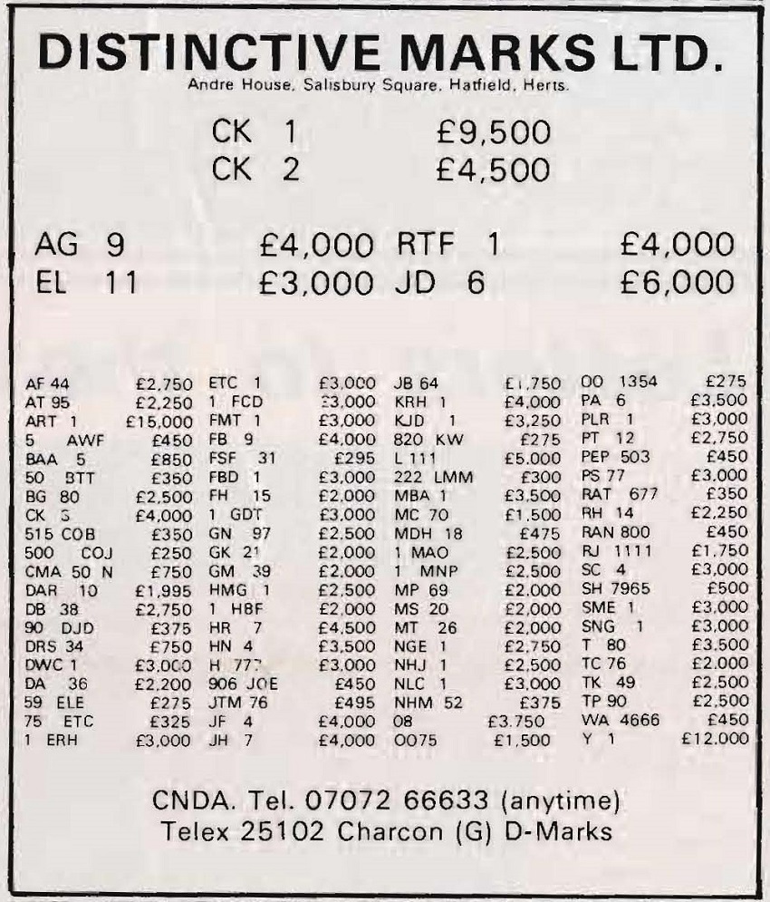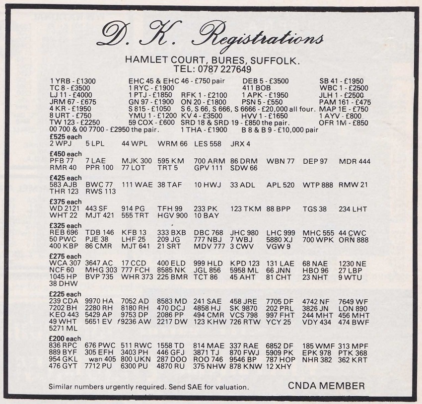 I've managed to date the advert to 1995/6 but when 1 A was sold at DVLA auction in December 1989 it sold for £202K, if a VAT registered company bought it then this dropped to £172K. So, a £172K plate is paired with its older sibling, a plate with the letter and number the right way round so certainly worth more, yet the asking price is just £380K + VAT (so 1 A represents at least 45% of this value). Strange. Someone did point out to me that the UK had a nasty recession in the very early 90's and this would certainly explain the pricing.